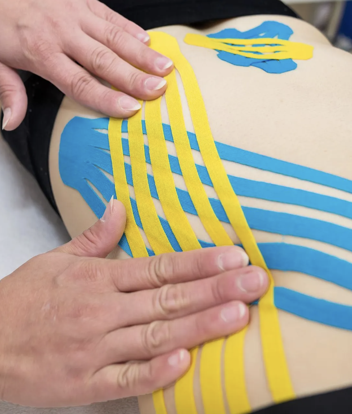 The tape provides temporary support and pain relief. To ensure long-term results, we combine taping with targeted exercises and manual therapy so the improvements are reinforced even after the tape comes off.